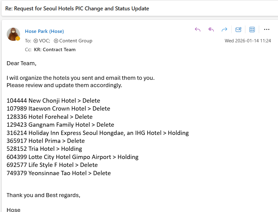 closedRequest for Seoul Hotels PIC Change and Status Update
