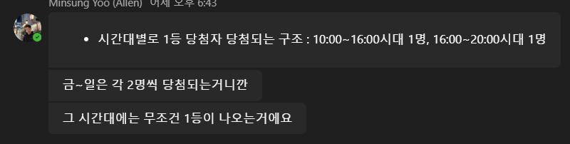 change first price: 목1 금,2 토2,일2 > giải nhất: 1/2/2/2