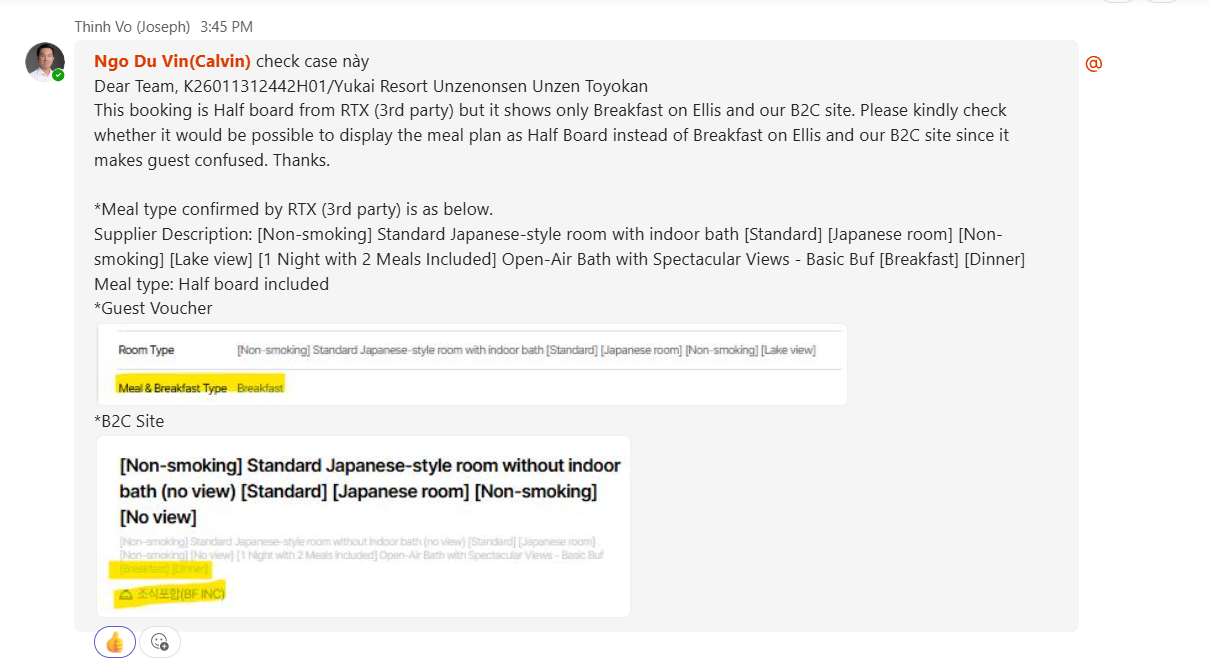 This booking is Half board from RTX (3rd party) but it shows only Breakfast on Ellis and our B2C site. Please kindly check whether it would be possible to display the meal plan as Half Board instead of Breakfast on Ellis and our B2C site since it makes guest confused. Thanks.
