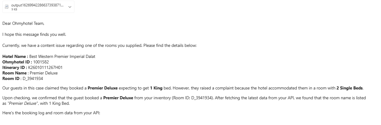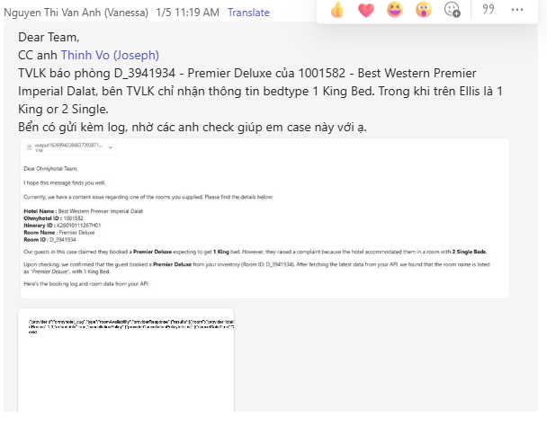 TVLK báo phòng D_3941934 - Premier Deluxe của 1001582 - Best Western Premier Imperial Dalat, bên TVLK chỉ nhận thông tin bedtype 1 King Bed. Trong khi trên Ellis là 1 King or 2 Single.
