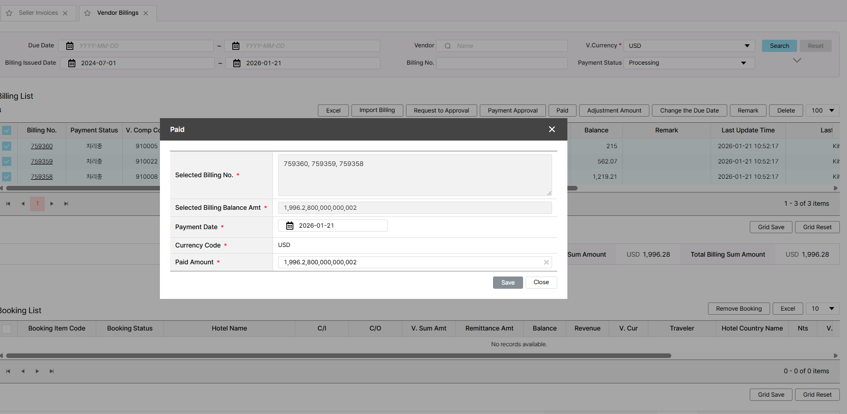 As you can see on the picture, the amount of selected billing is incorrect when using "Paid" which is casusing an issue that KRAC team could not complete the billing payment.