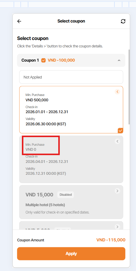 If min purchase is 0, min purchase field will be not show on coupon card on select coupon list?