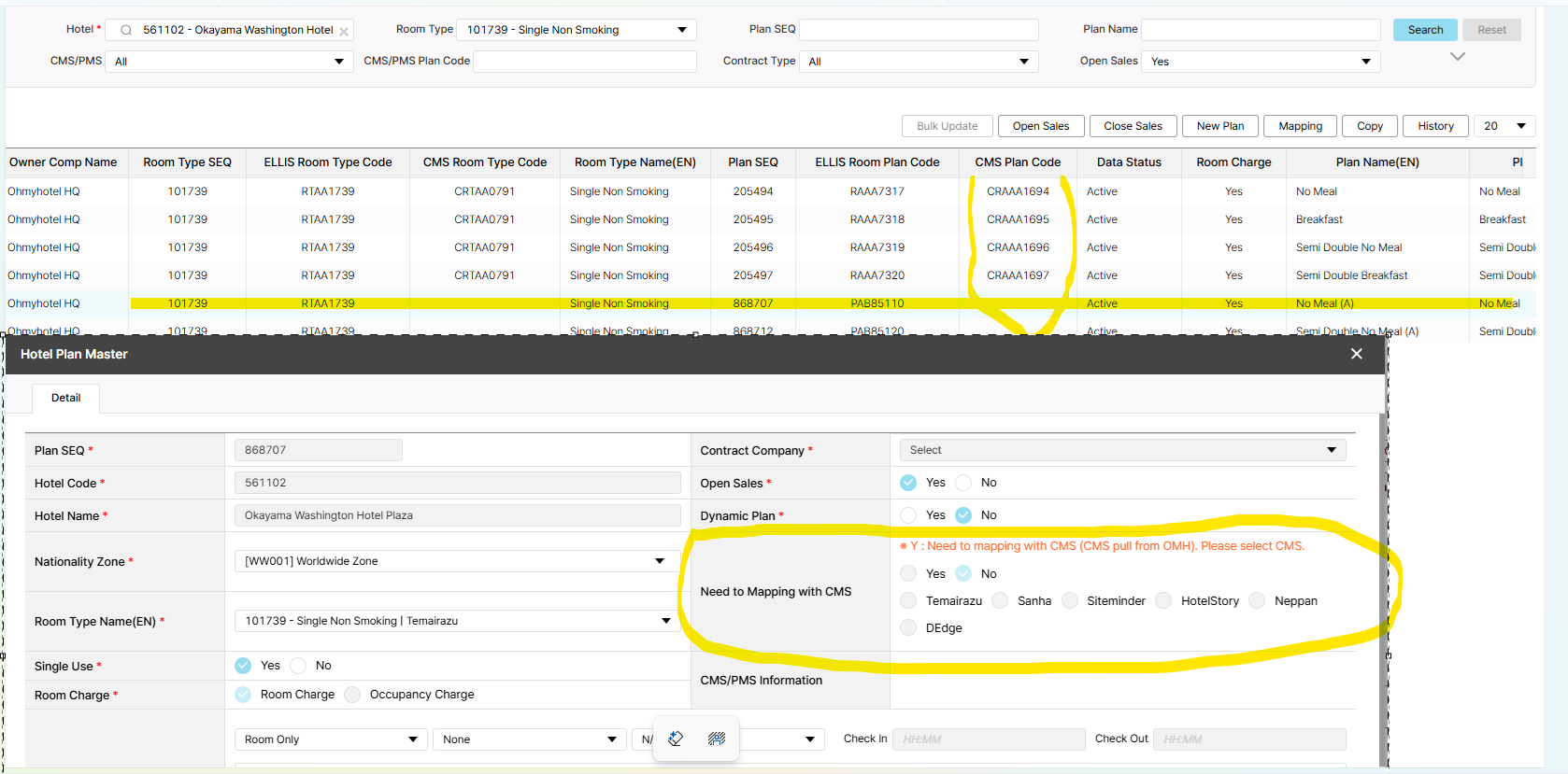 The plan 868707 has not been mapped with CMS Temairazu yet. Please map it in Ellis first, and then ask the hotel to pull the data and complete the mapping on their side.