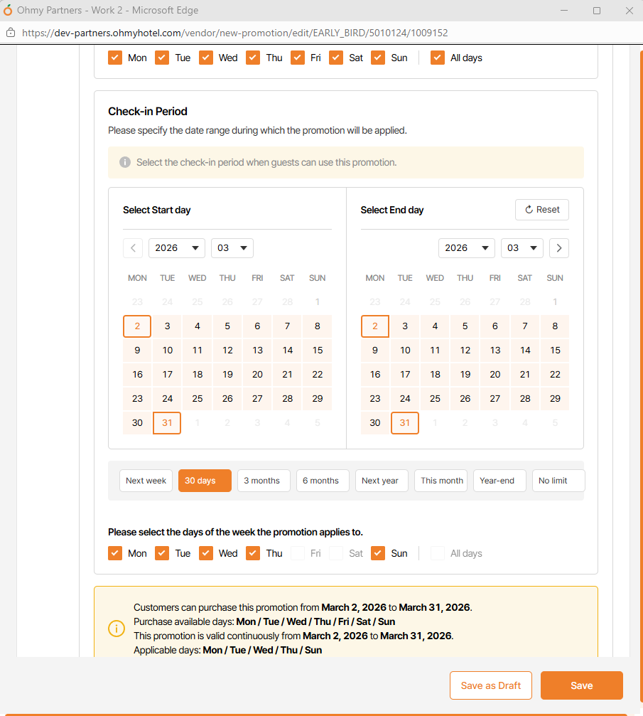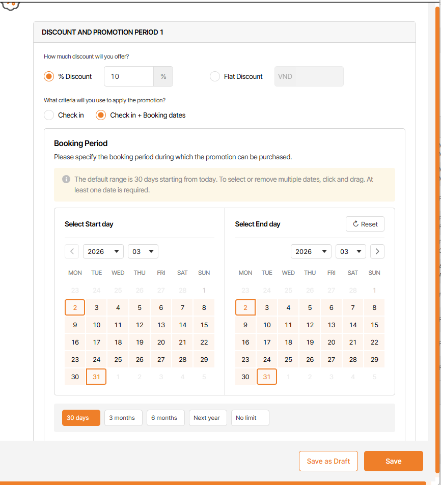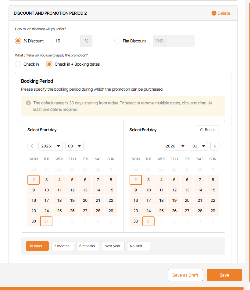 • Add more Discount & Period 2 below the same booking & check in period with Discount & Period 1