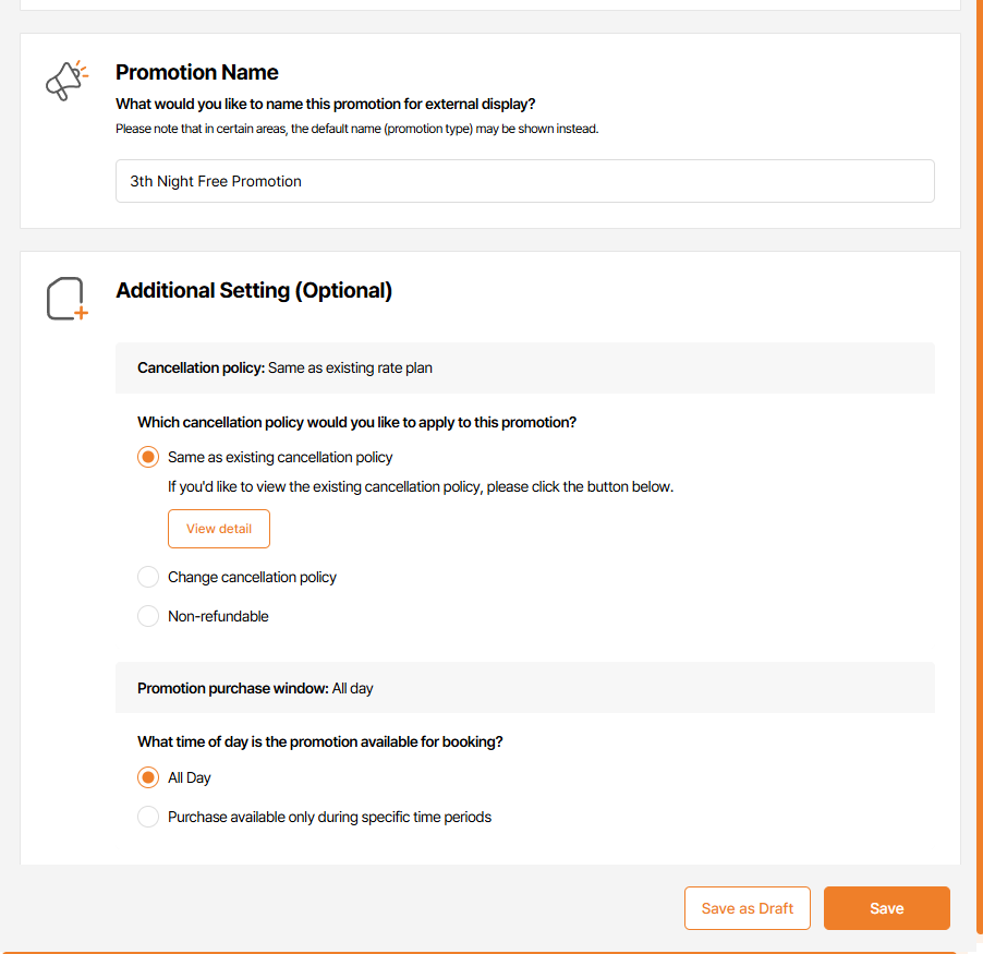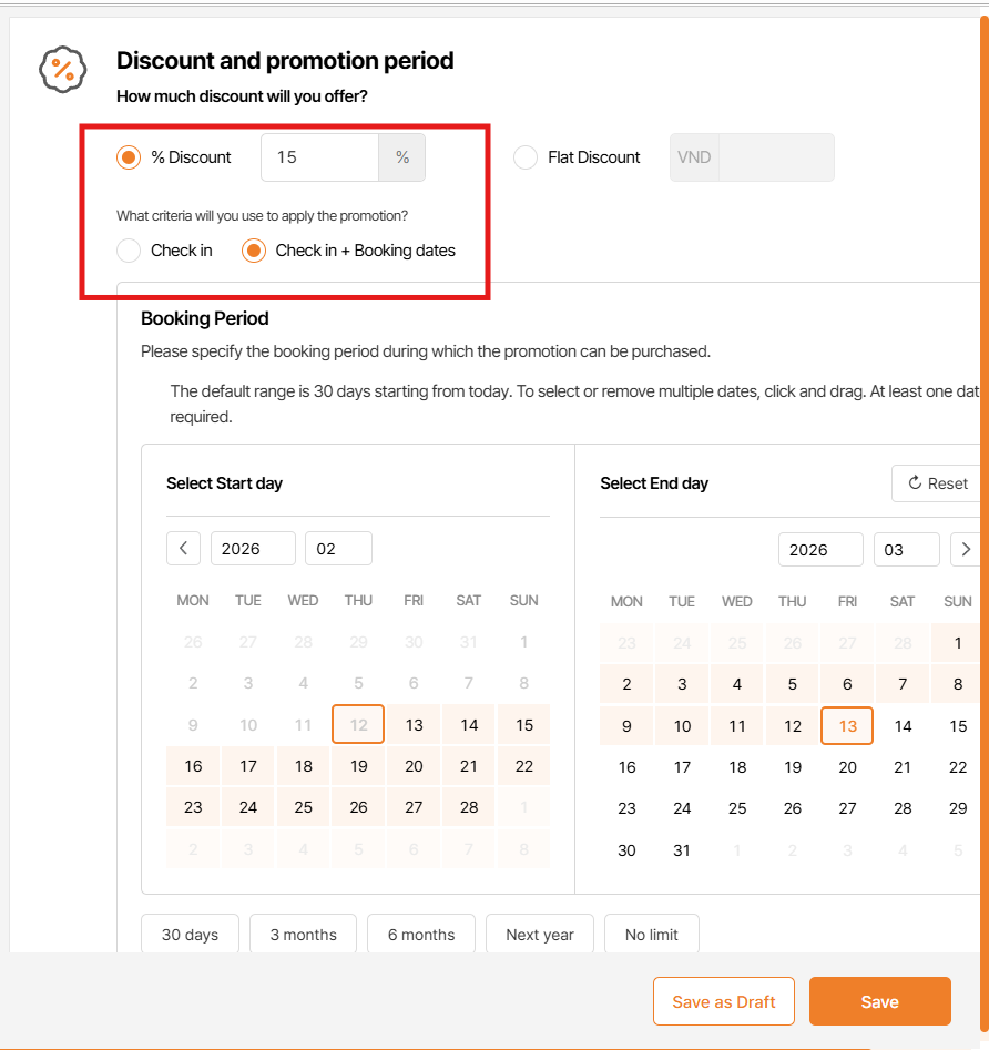 Test step: Create new / Edit /Copy promotion > input all required data > in Discount & promotion period section, select Check in + Booking dates option > click save
