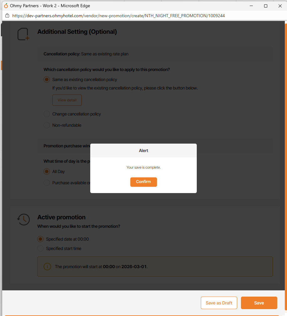 Expected: save success & both Check in/ Booking period is displayed in Period column on View promotion