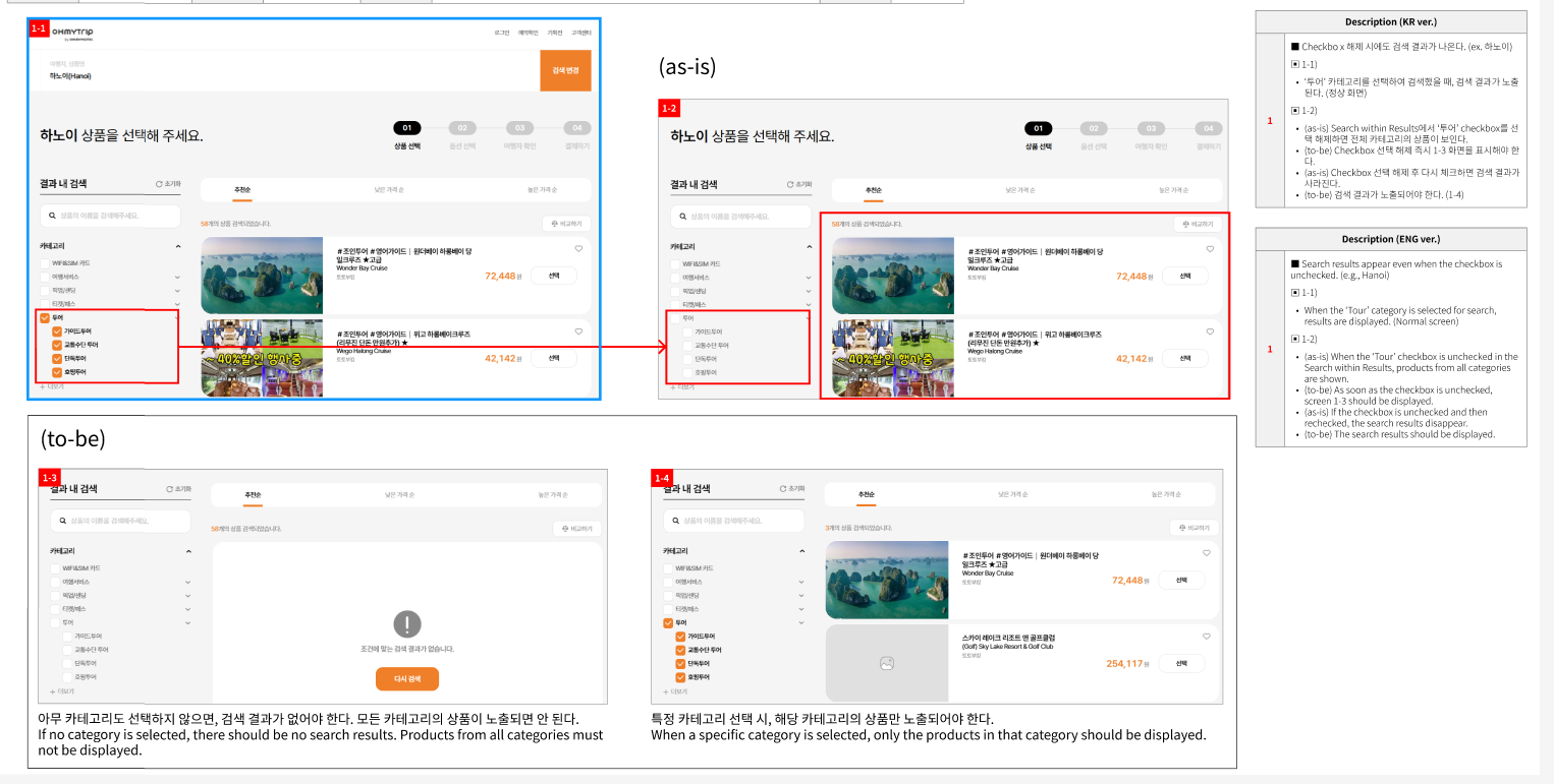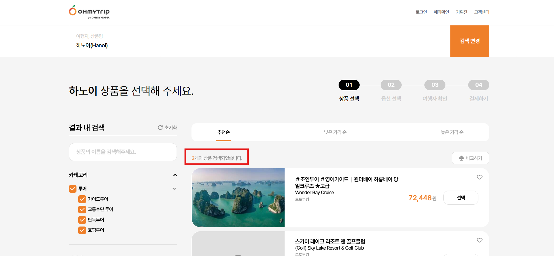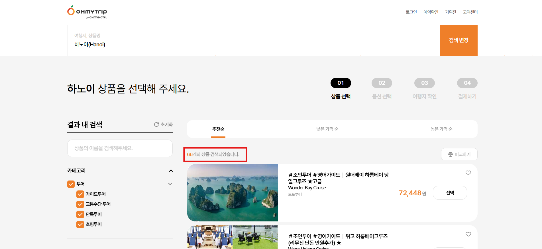 (Example) There are 67 active tour products for Hanoi registered in the admin. In the first screenshot, when searching for Hanoi > Tour on the main page, 66 products are displayed. However, after unchecking all the checkboxes and then checking ‘Tour’ again, only 3 products are shown.