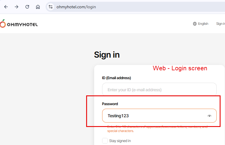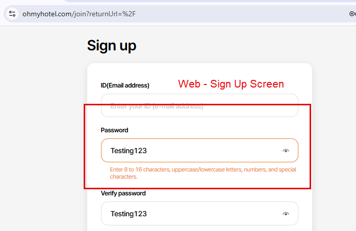 - Check eye icon displayed well in Sign Up screen and user can see their password after click on from web -> Passed