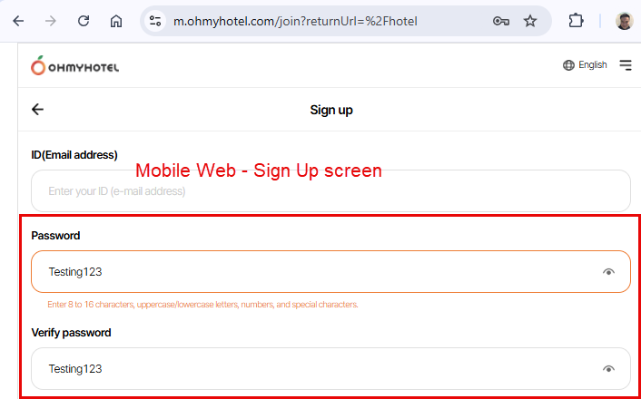 - Check eye icon displayed well in Sign Up screen and user can see their password after click on from web mobile -> Passed