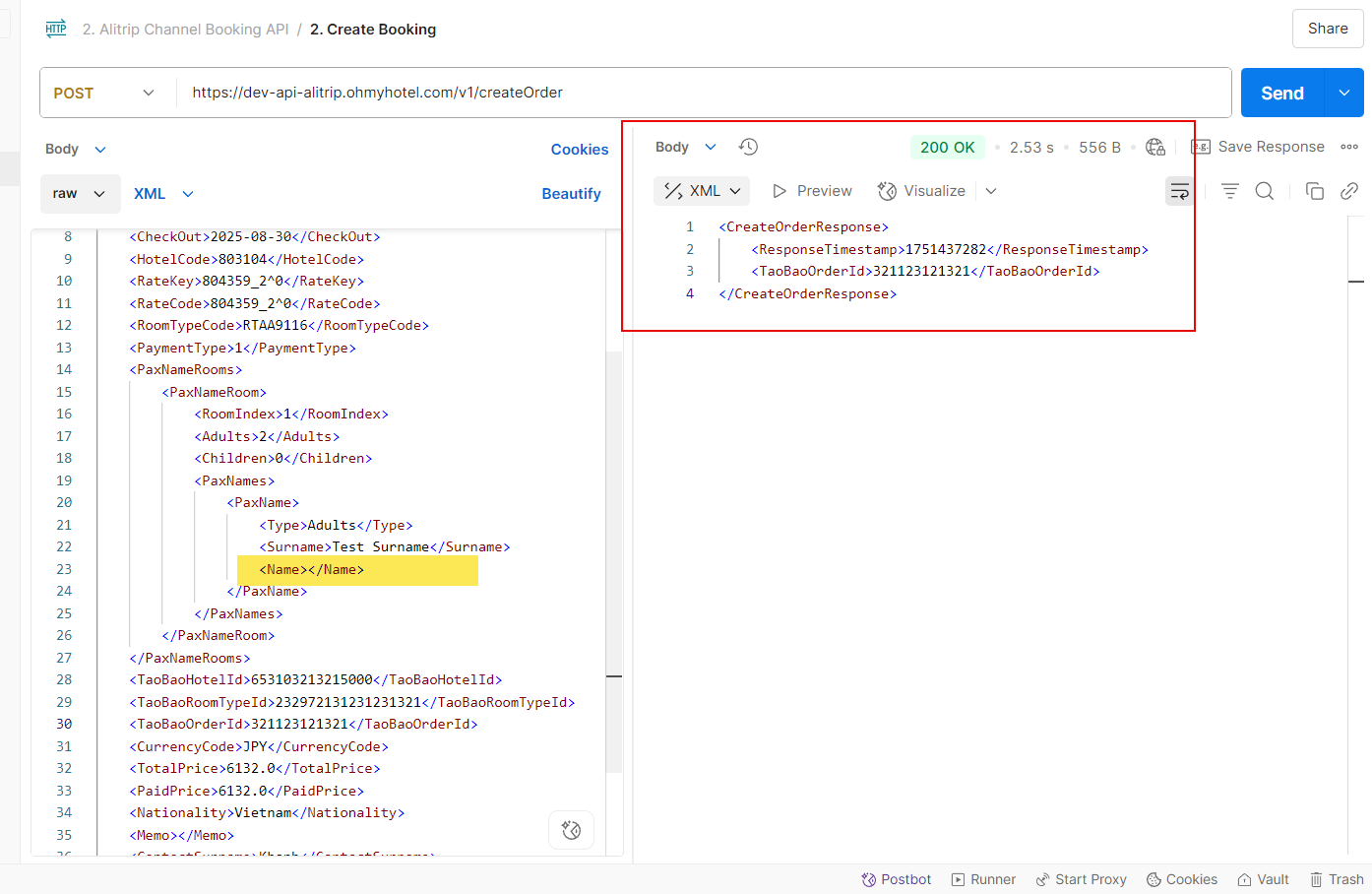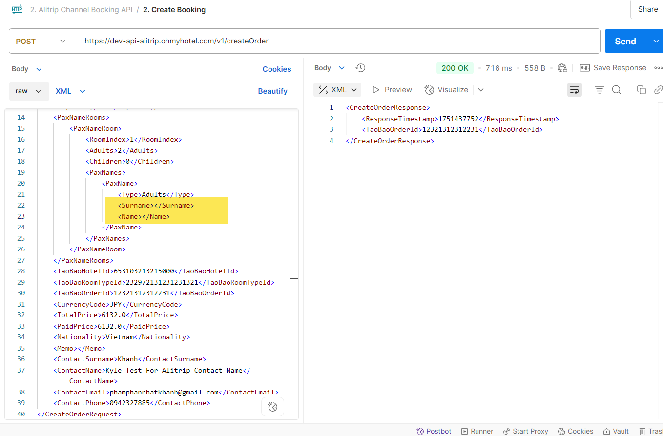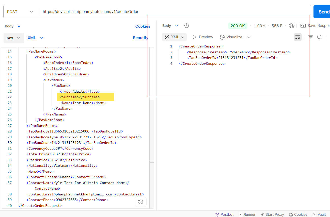 "<CreateOrderRequest><AuthenticationToken><Username>alitrip</Username><RequestTimestamp>1750892407</RequestTimestamp><Signature>b91f6dfc150a586200a9eb4cc785bfa40f800d02e7e7afb17a3d42514c1c618e</Signature></AuthenticationToken><CheckIn>2025-08-02</CheckIn><CheckOut>2025-08-03</CheckOut><RateKey>832056_2^1^8</RateKey><RateCode>832056_2^1^8</RateCode><RoomTypeCode>RAA16393</RoomTypeCode><HotelCode>846894</HotelCode><PaymentType>1</PaymentType><RateCategory>2</RateCategory><PaxNameRooms><PaxNameRoom><RoomIndex>1</RoomIndex><Adults>2</Adults><Children>1</Children><ChildrenAges><Age>8</Age></ChildrenAges><PaxNames><PaxName><Surname>JINRI</Surname><Name>CHA</Name><Type>Adults</Type><SalesCountry>KR</SalesCountry><UserCountry>KR</UserCountry></PaxName><PaxName><Surname>DAEWON</Surname><Name>LEE</Name><Type>Adults</Type><SalesCountry>KR</SalesCountry><UserCountry>KR</UserCountry></PaxName><PaxName><Surname></Surname><Type>Children</Type><SalesCountry>KR</SalesCountry><UserCountry>KR</UserCountry></PaxName></PaxNames></PaxNameRoom></PaxNameRooms><TaoBaoHotelId>666934813880</TaoBaoHotelId><TaoBaoRoomTypeId>3808187108880</TaoBaoRoomTypeId><TaoBaoOrderId>45693566330131022</TaoBaoOrderId><CurrencyCode>JPY</CurrencyCode><TotalPrice>14683.0</TotalPrice><PaidPrice>15932.35</PaidPrice><Nationality>Mainland</Nationality><Memo></Memo><ContactSurname>JINRI</ContactSurname><ContactName>CHA</ContactName><ContactEmail></ContactEmail><ContactPhone>01032498868</ContactPhone></CreateOrderRequest>",