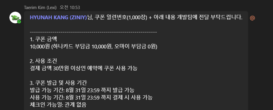 (Hana: 10,000 KRW, Ohmyhotel 0)