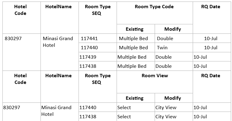 Please kindly assist to change the Room type Code of 830297 - Minasi Grand Hotel as below: