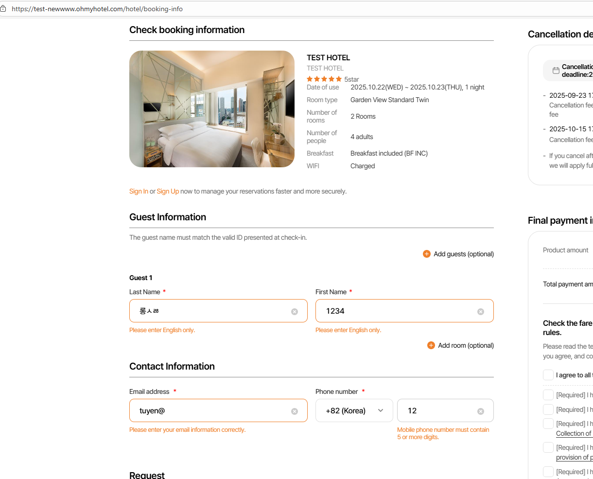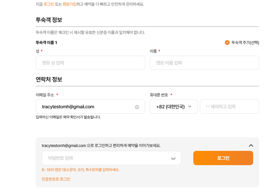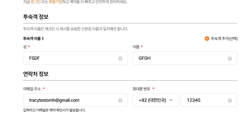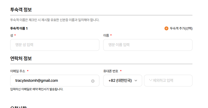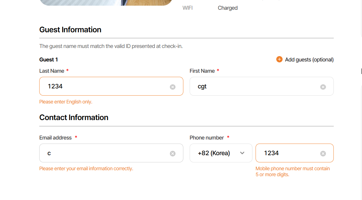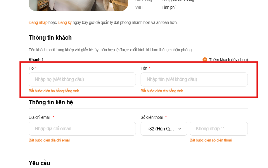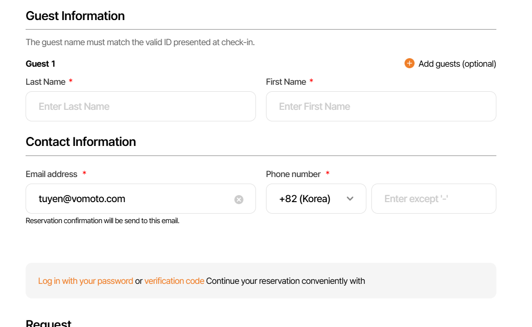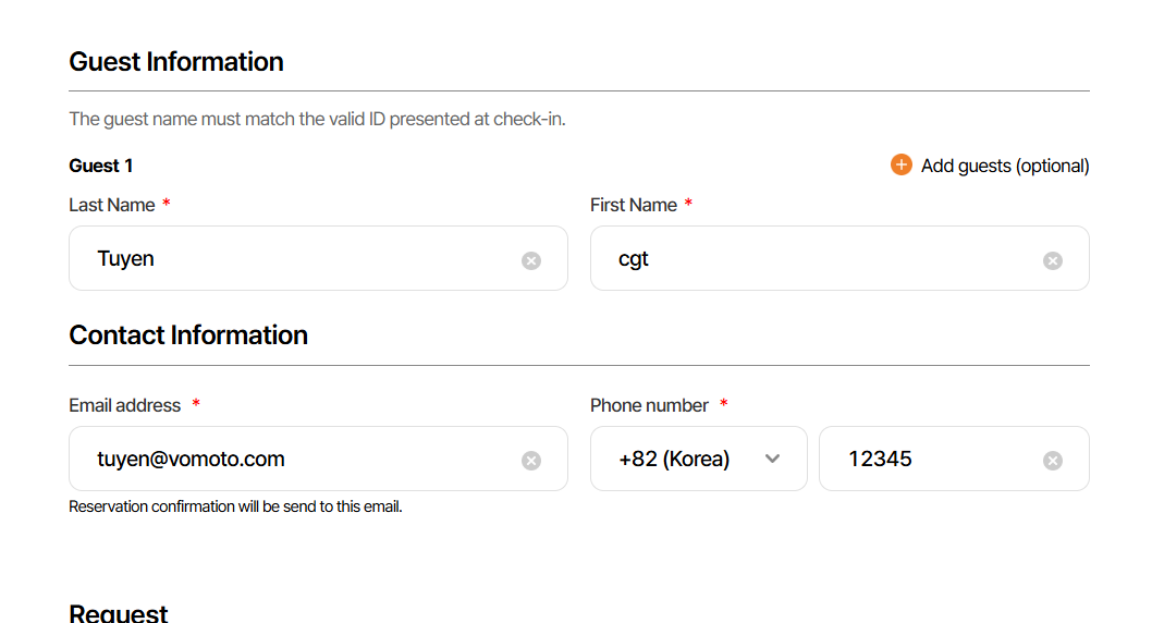 - Ở giao diện này có 2 btn, btn đầu tiên là thêm guest information, khi click-> hiển thị thêm 1 field nhập họ và tên guest dưới field nhập mặc định. Khi này sẽ chia ra thành guest 1 và guest 2,..