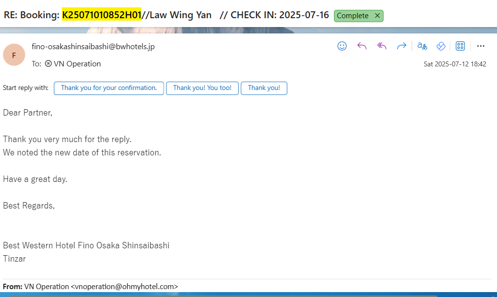 [VOC]: DATE CHANGE REQUEST - K25071010852H01 // Best Western Hotel Fino Osaka Shinsaibashi