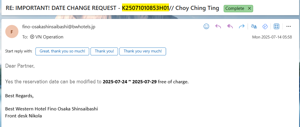 closed[VOC]: DATE CHANGE REQUEST - K25071010853H01 // Best Western Hotel Fino Osaka Shinsaibashi