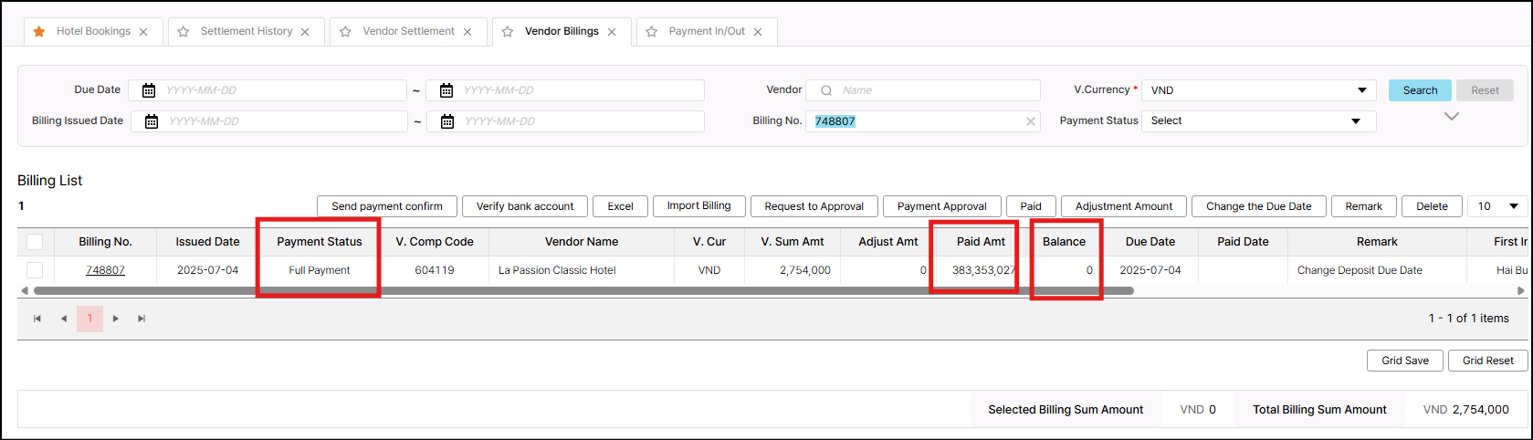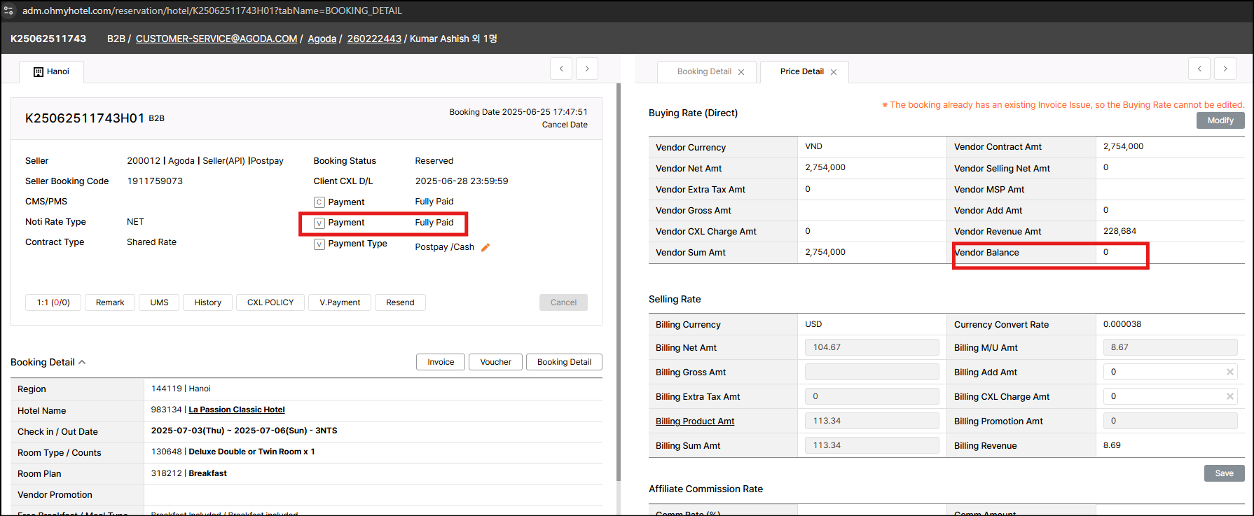 [VOC]: ID 983134_Payment for 01 new booking(s) Jul 04,2025: 2,754,000 VND